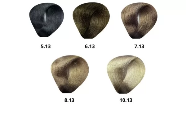 4.27 VIOLET TOBACCO BROWN, 5.13 ASH GOLDEN LIGHT BROWN, 6.29 VIOLET BLUE DARK BLOND, 6.38 GOLDEN BEIGE DARK BLOND, 900.12 SUPERBLEACHING ASH VIOLET BLOND, 900.82 SUPERBLEACHING BEIGE VIOLET BLOND,